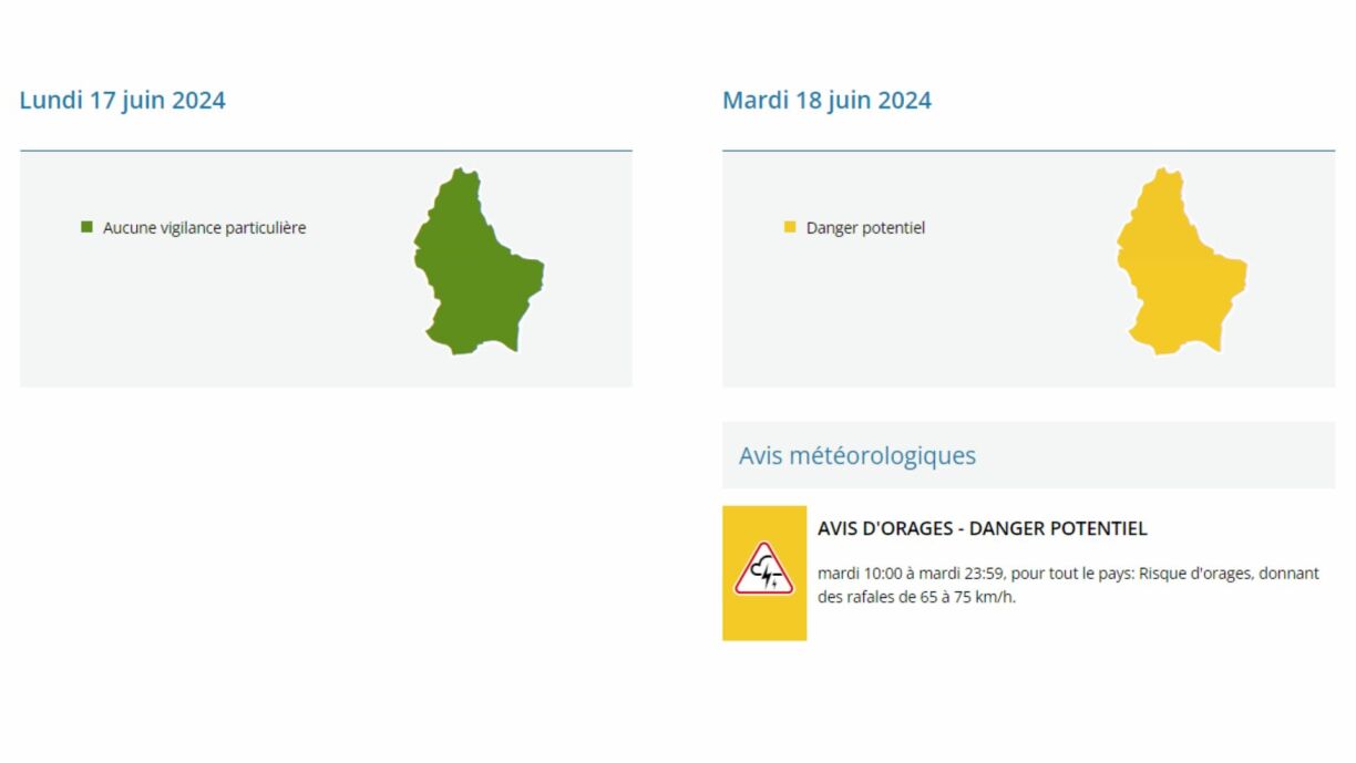 A yellow alert has been issued by Meteolux for Tuesday 18 June, from the second part of the morning until the end of the evening. Luxembourg’s weather service predicts a variably cloudy day with moderate to heavy rain showers and possible thunderstorms, including gusts of wind of between 65 and 75 km/h.