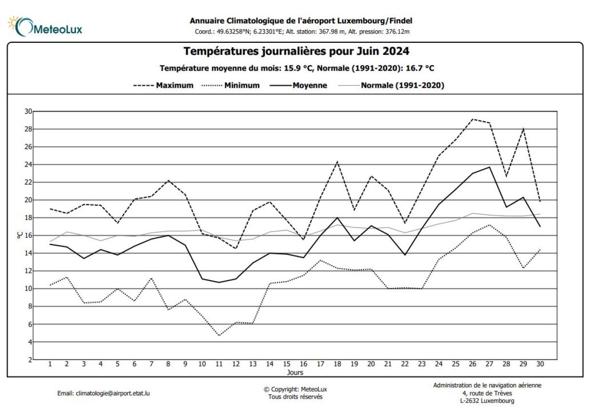 In June 2024, temperatures were 0.8°C lower than the average of 16.7°C from the 1991–2020 reference period. However, when compared to the average from 1961 to 1990, which was 14.9°C, then this June was actually 1°C warmer than the average. “One should not forget that the period from 1991 to 2020 already bears the clear mark of climate change”, explains Luca Mathias from Meteolux in conversation with RTL.