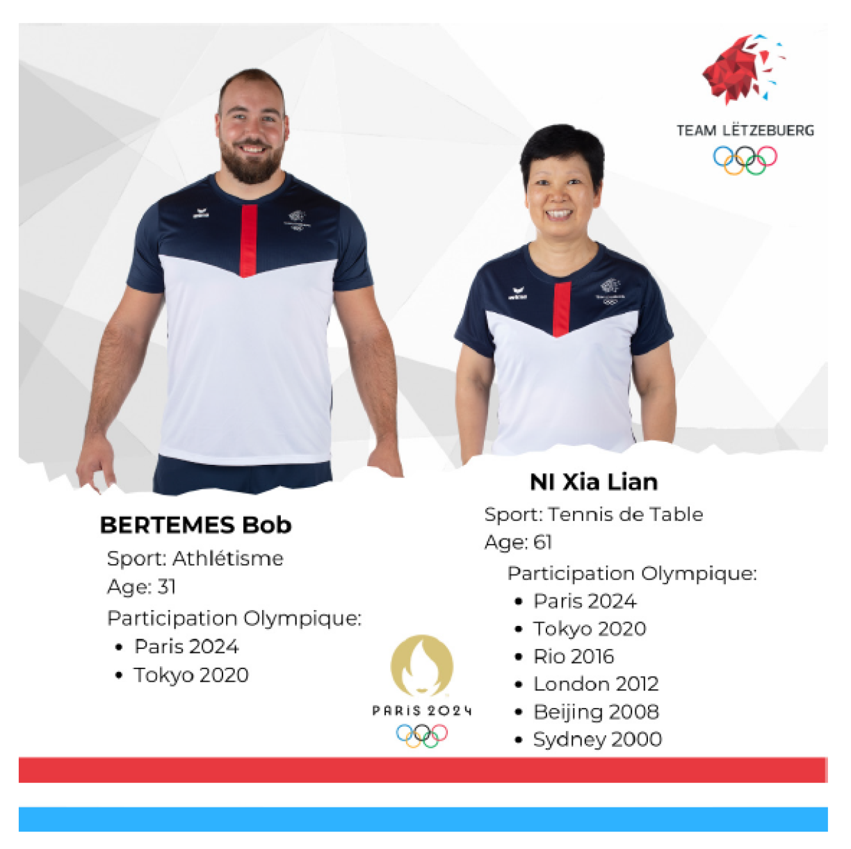 Table tennis star Ni Xia Lian and shot put athlete Bob Bertemes will carry the Luxembourg flag at Friday’s opening ceremony for the Paris Games. Both were selected for their athletic prowess and successful careers so far. This will be the sixth Games for Ni Xia Lian, while Bob Bertemes is set to appear for the second time, although he is likely to bring his professional career to an end following the Olympics.