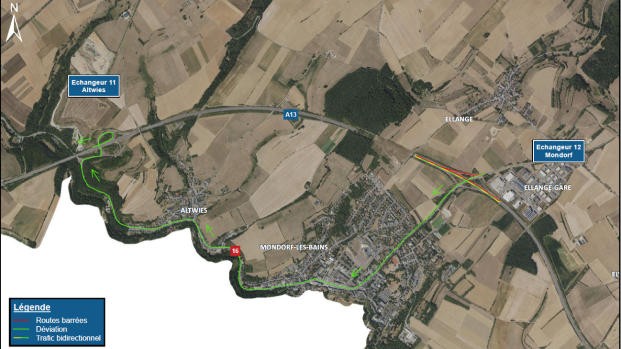 Traffic coming from the N16 on to the A13 towards Esch-sur-Alzette will be diverted from the Mondorf interchange via the N16 and the Altwies interchange.