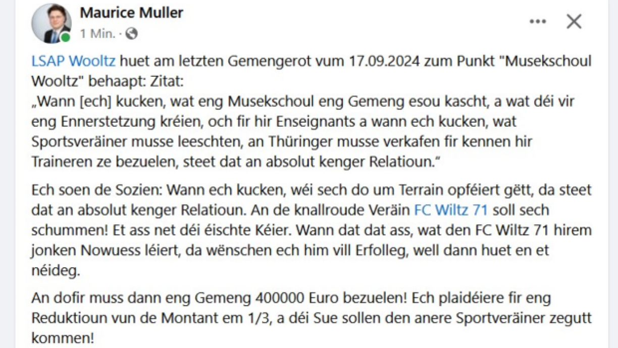 Muller further suggested that the municipality reduce its annual financial support to FC Wolz 71, currently €400,000, by one third, and redirect the funds to other sports clubs. His criticism was also specifically aimed at the LSAP, likely due to Schenk’s affiliation with the party.
