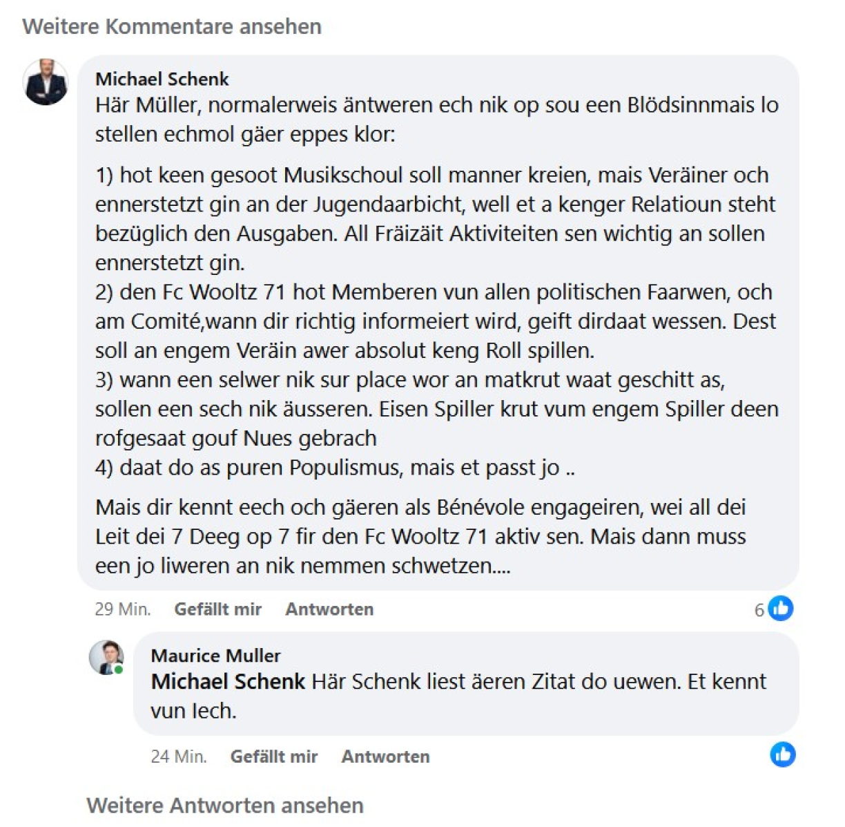 In a post on his Facebook page, Muller criticised the club, stating that the “bright red” football team should be “ashamed.” The reference to the colour likely alludes to FC Wolz 71’s president, Michael Schenk, who is also a local councillor representing the Luxembourg Socialist Workers’ Party (LSAP).