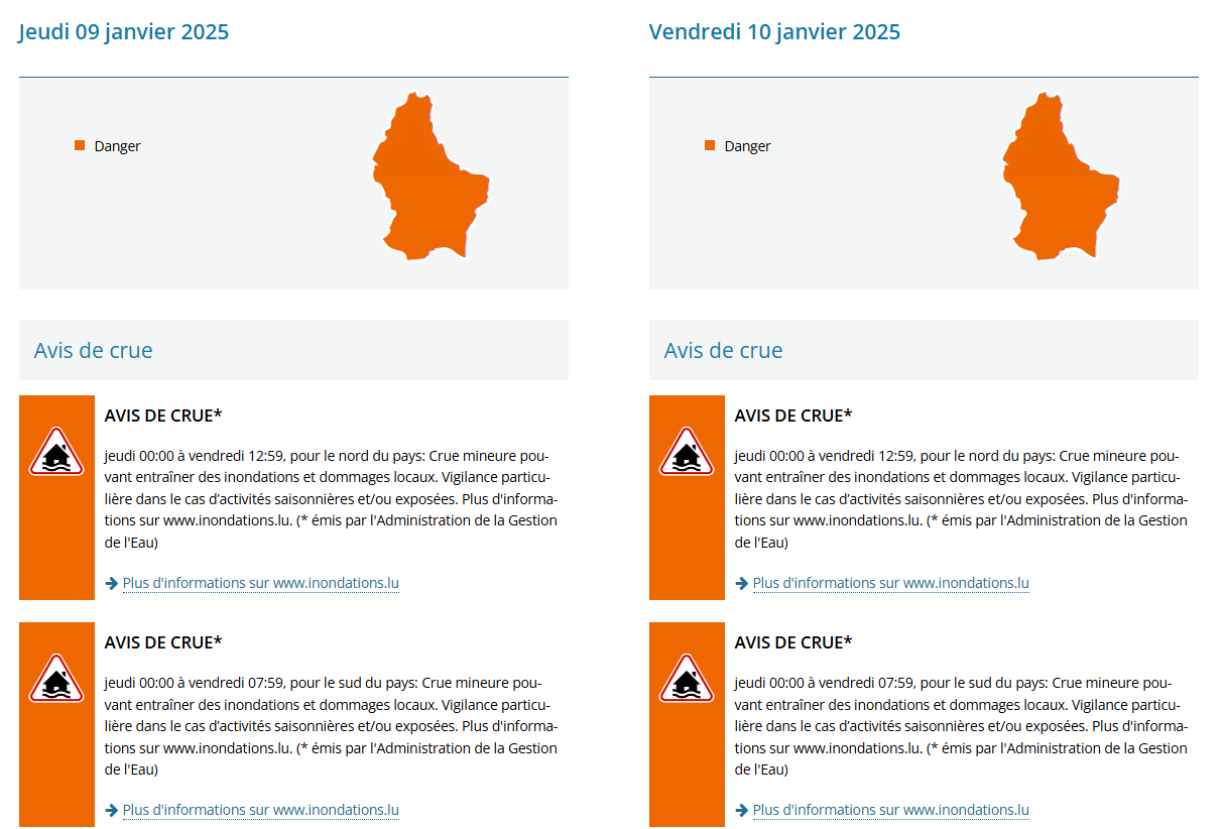 The orange alert, which began at midnight on Thursday, follows a yellow alert issued on Wednesday due to snowfall that caused chaos on Luxembourg’s roads and at Findel Airport. The orange alert will remain in place until 6pm on Friday for the North and until 6pm on Sunday for the Moselle region but has been lifted for the South of the country. Meteolux warns that minor flooding could escalate, particularly in flood-prone areas, potentially leading to localised damage.