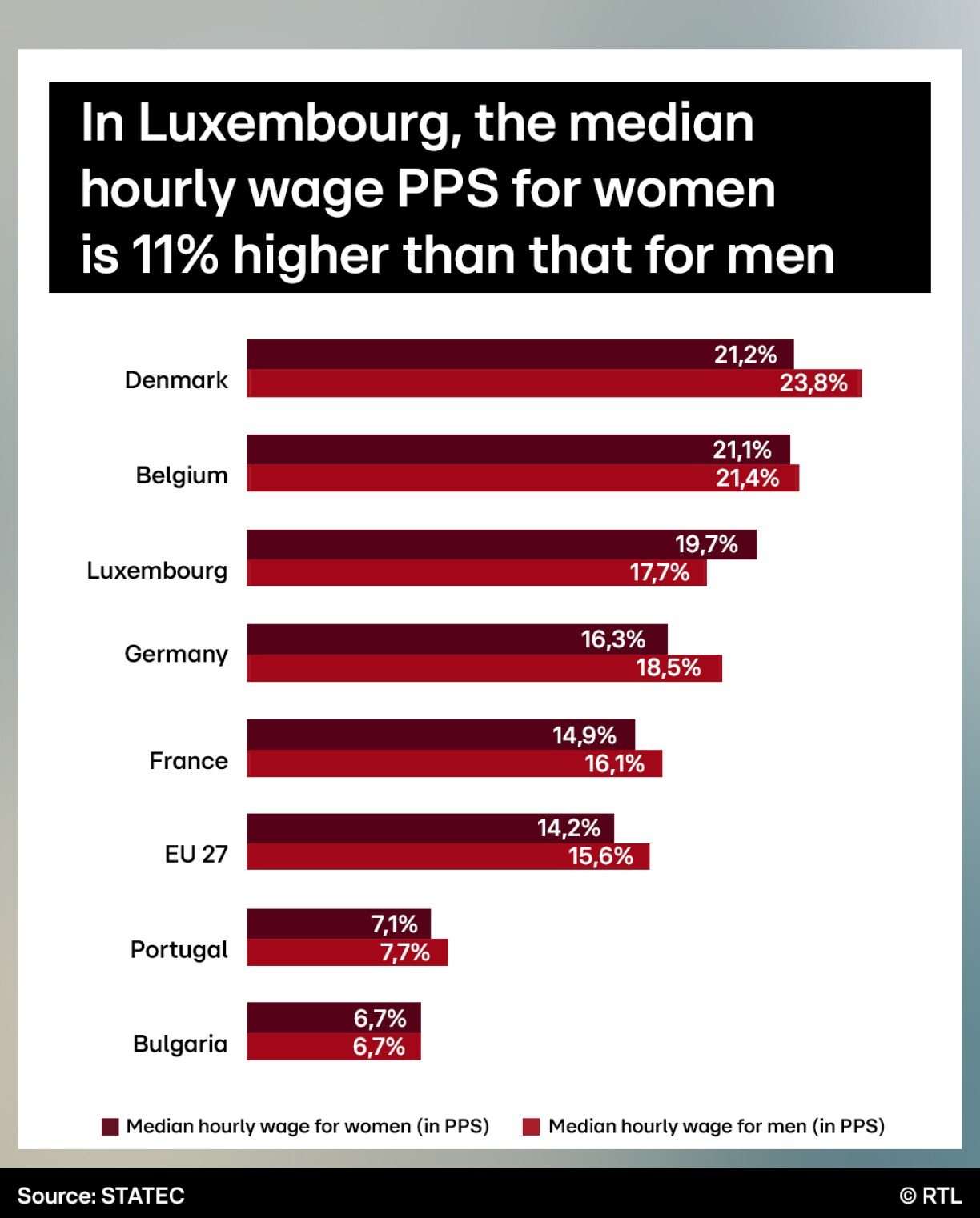 The Grand Duchy stands out for its high wages, ranking second in the EU with a median hourly wage of €24. Notably, Luxembourg is a European exception in gender pay: women earn slightly more than men on average.