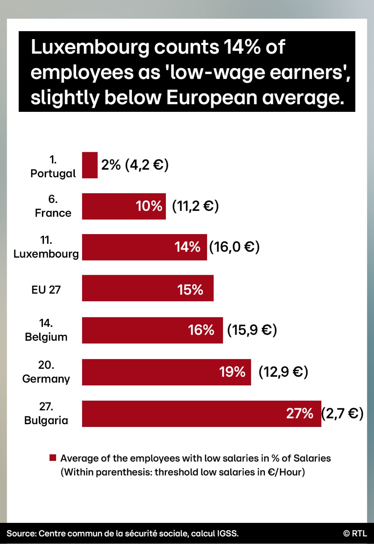 A “low salary” is defined as €16/hour – far above Bulgaria’s €2.7/hour but below Denmark’s €19.9/hour threshold. Only 14% of employees fall into this category, placing Luxembourg 11th in the EU, slightly below the bloc’s average.