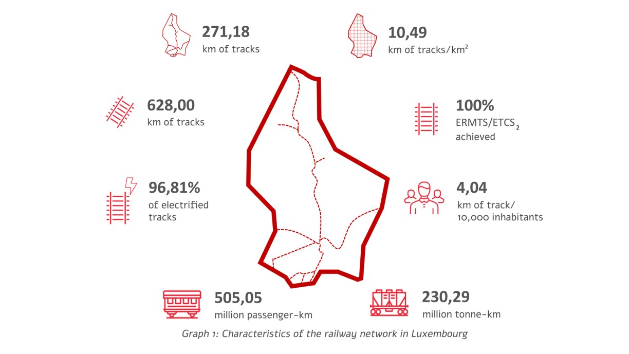 Luxembourg has 10.49 kilometres of railway lines per square kilometre. This places the country close to regional leaders Belgium (11.8 km/km²), Germany (10.9 km/km²), and the Netherlands (8.9 km/km²), and well ahead of France (under 5 km/km²).
