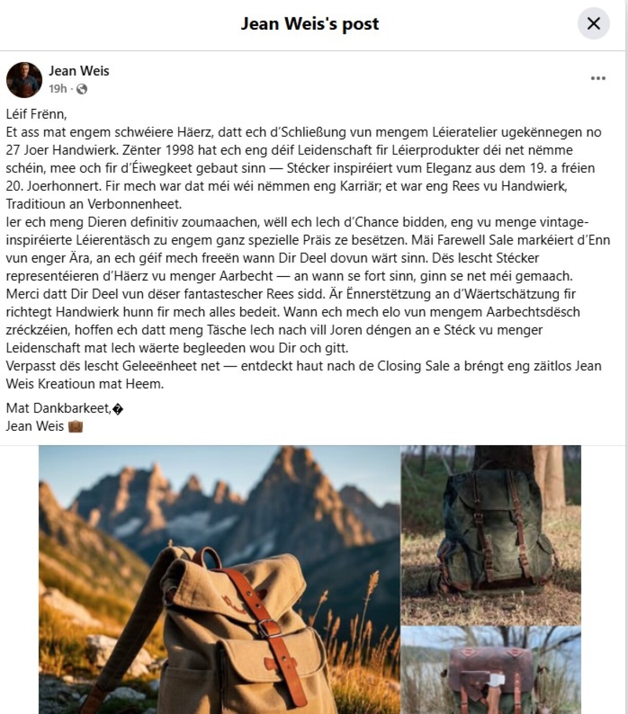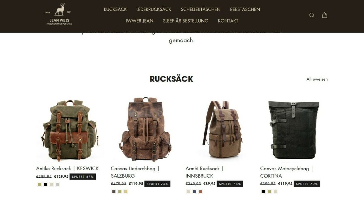 Several warning signs point to potential fraud. The website contains numerous spelling mistakes and unnatural Luxembourgish phrasing. On Facebook, where “Jean Weis” heavily promotes his products, the first post only dates back to 13 July 2025, just over a week ago. This is obviously at odds with the story that Weis has supposedly been making his bags since 1998.