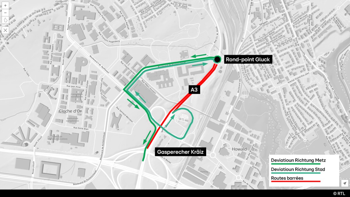 Traffic will be redirected from the roundabout via the Croix de Gasperich, Boulevard Kockelscheuer and Boulevard Raiffeisen to the Hesperange junction. Cars travelling in the opposite direction will go via Boulevard Kockelscheuer and Boulevard Raiffeisen towards the roundabout.