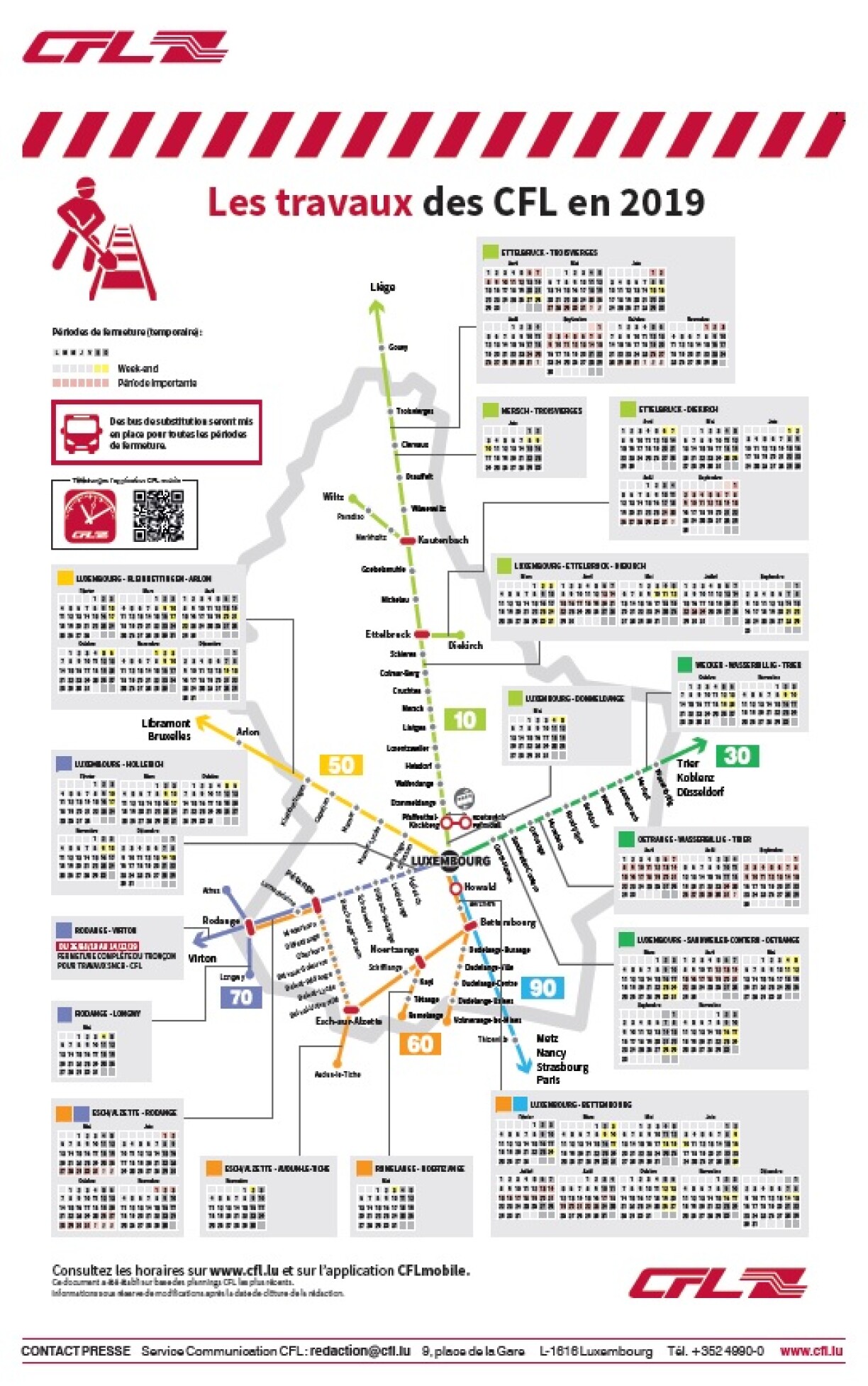 As for those interested in the lines heading towards Belgium, the line between Luxembourg and Arlon will only be affected at weekends. However, there will be no trains between Rodange and Virton between 26 August and 14 December.