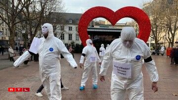 The protesters wore personal protective equipment to which they had attached notes and signs bearing sarcastic messages such as “Get vaccinated” or “Money makes you sick”.