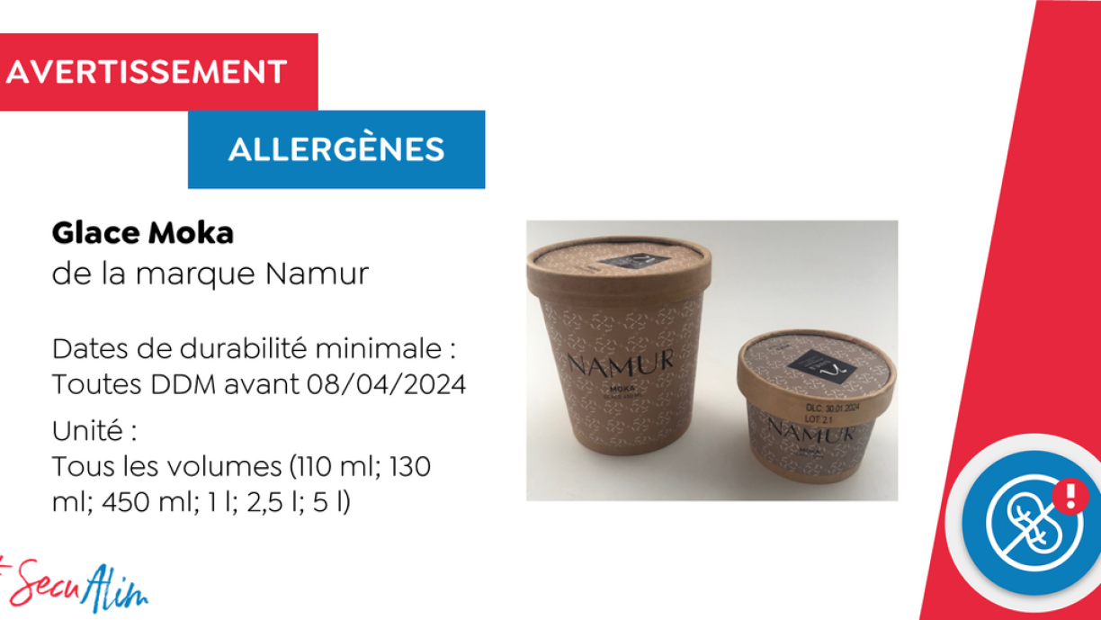 The warning concerns Namur’s mocha ice cream in 110, 130 and 450ml tubs as well as in 2.5 and 5 litre tubs. All batches with the use-by date of 8 April 2024 are affected.