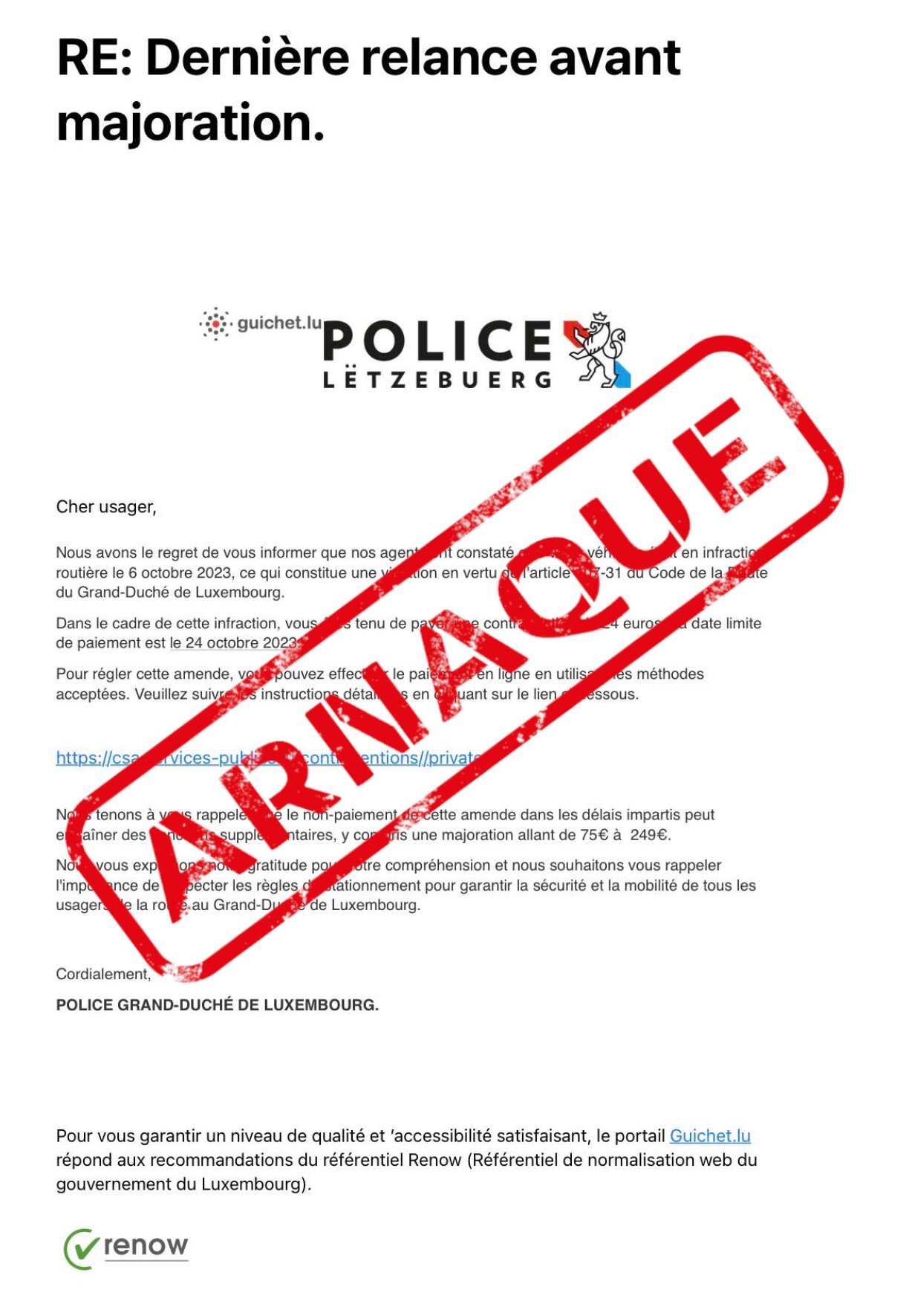 The emails claim to be sent on behalf of the Grand Ducal police and Guichet.lu, and usually demand money from the recipient due to an alleged traffic offence.