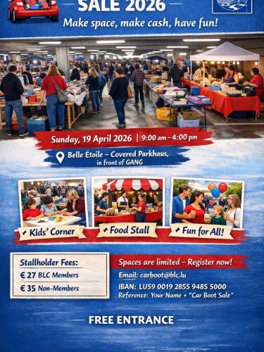 BLC is excited to announce their annual car boot sale, which will happen this Sunday, 19 April, from 9am to 4 pm at the covered car park of the Belle Étoile.