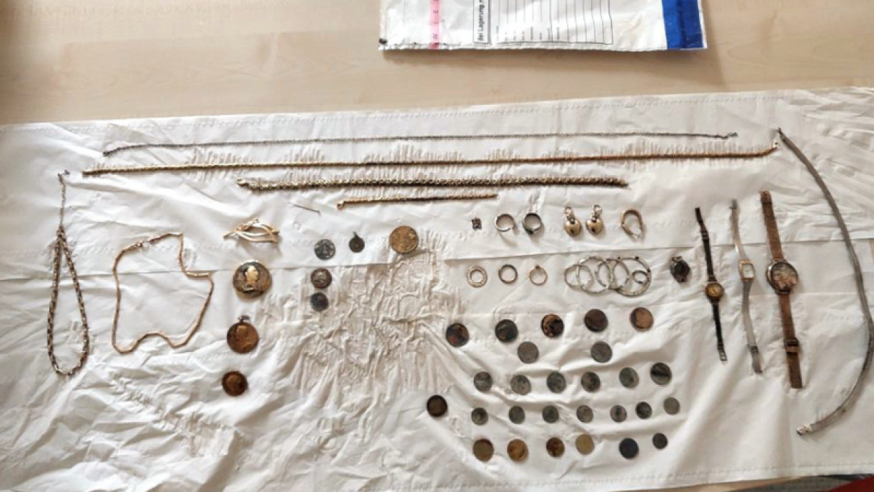 The recovered property includes several antique gold watches, necklaces, coins, and assorted pieces of jewellery.