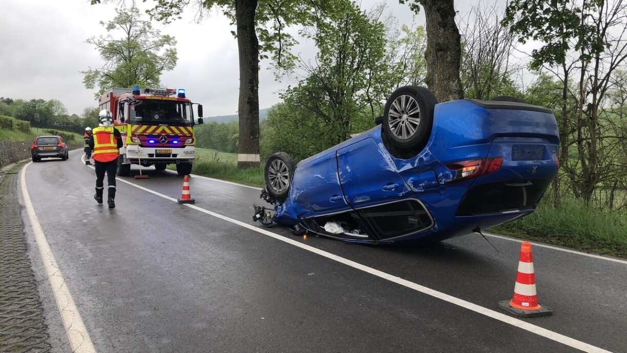 At approximately 8.50am, a car overturned onto its roof on the CR122 between Olingen and Rodenbourg. It appears that the driver lost control of his vehicle in a left bend, although the exact cause remains unknown. The car hit a wall before rolling over on the road.