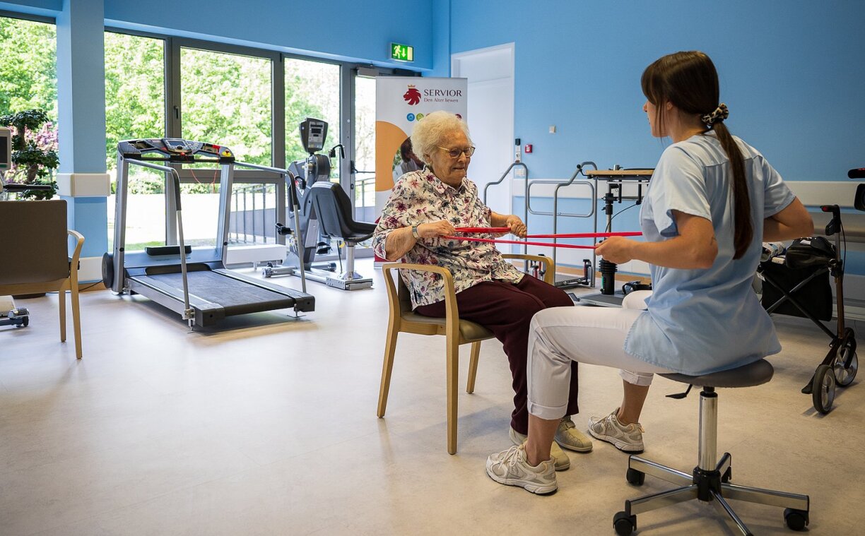 Physiotherapist Jasmin Streit explained that their mission isn’t just about mobility, but also about maintaining residents’ autonomy for as long as possible. She highlighted how essential it is for elderly people to retain the ability to care for their own hygiene, and that’s why exercises for arms, hands, and legs are so important. Based on a doctor’s prescription, each resident is assigned therapy sessions adapted to their individual diagnosis, according to Streit. Most residents receive physiotherapy one to three times a week.