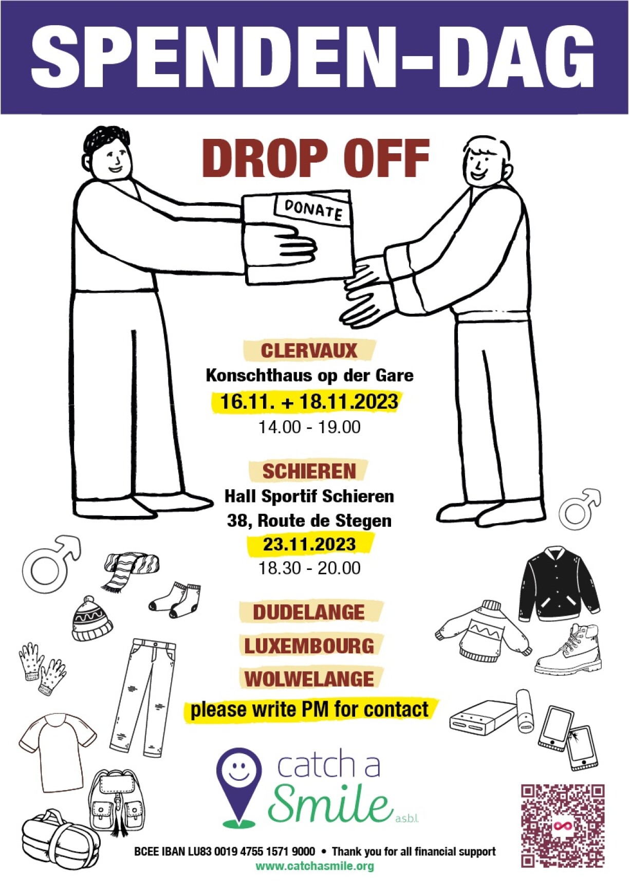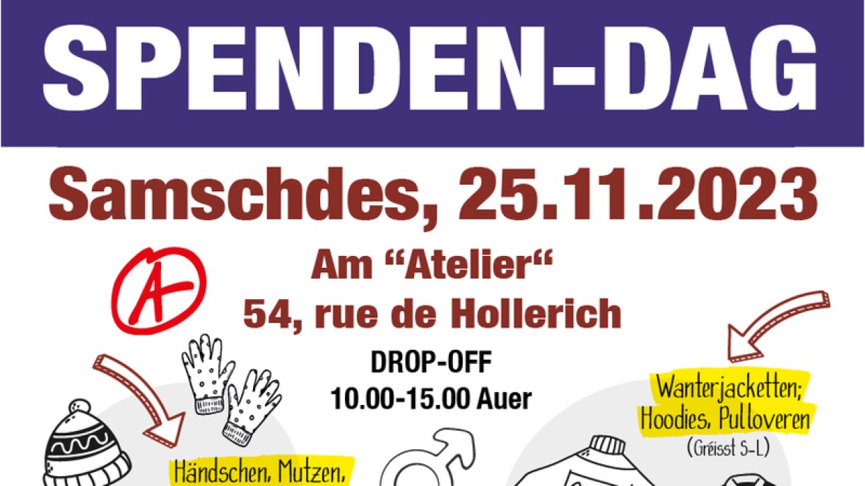 If you are unable to attend the event, donations can also be taken to any of the below drop-off points in Clervaux, Schieren, Dudelange, Wolwelange or Luxembourg City.