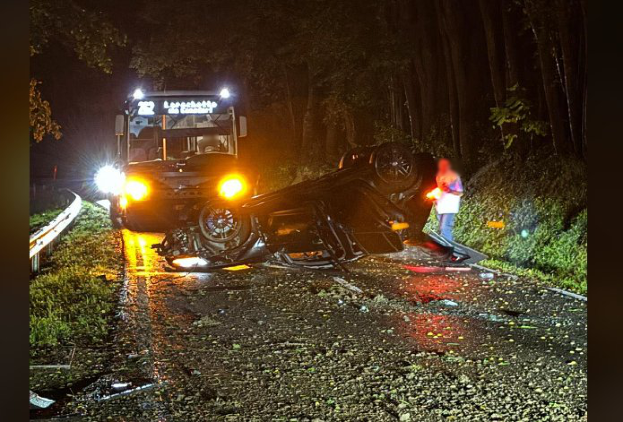 The incident unfolded as the driver traversed the CR118 between Christnach and Müllerthal, abruptly losing control of the vehicle, resulting in the car flipping over and ending up in the middle of the road. The road had become slippery due to heavy rainfall.