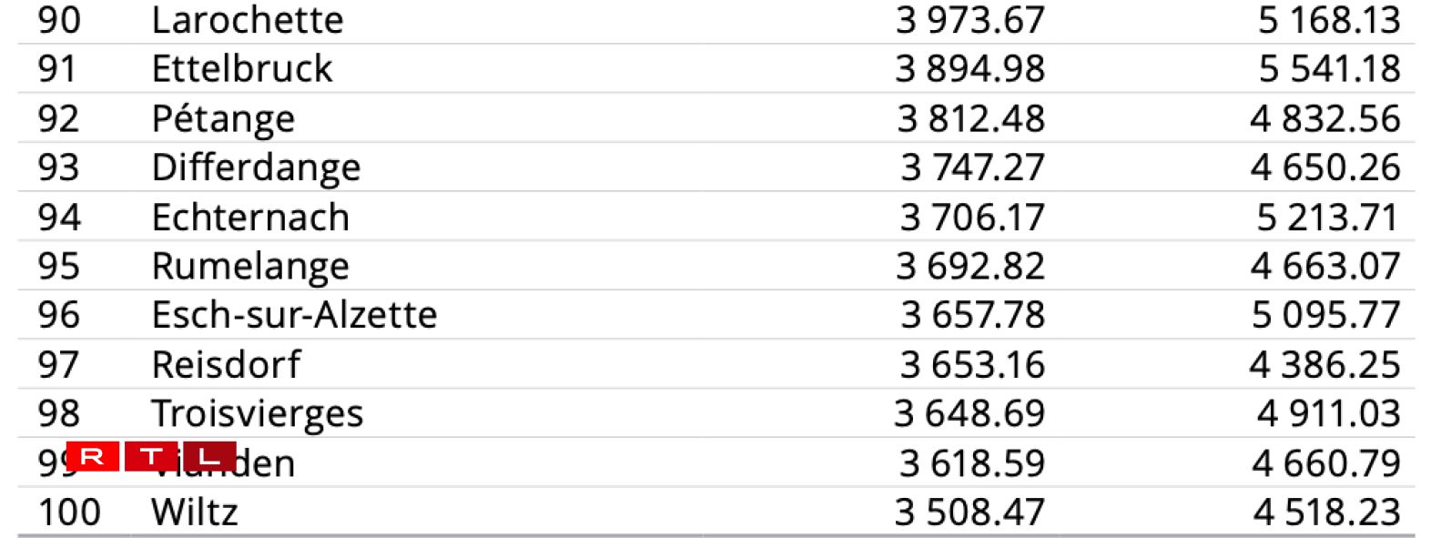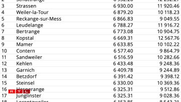 The latest figures, provided by the National Institute of Statistics and Economic Studies (STATEC), show Niederanven maintaining its top position in the annual ranking. Its average monthly salary has risen markedly over two years, from €12,645 to €14,258.