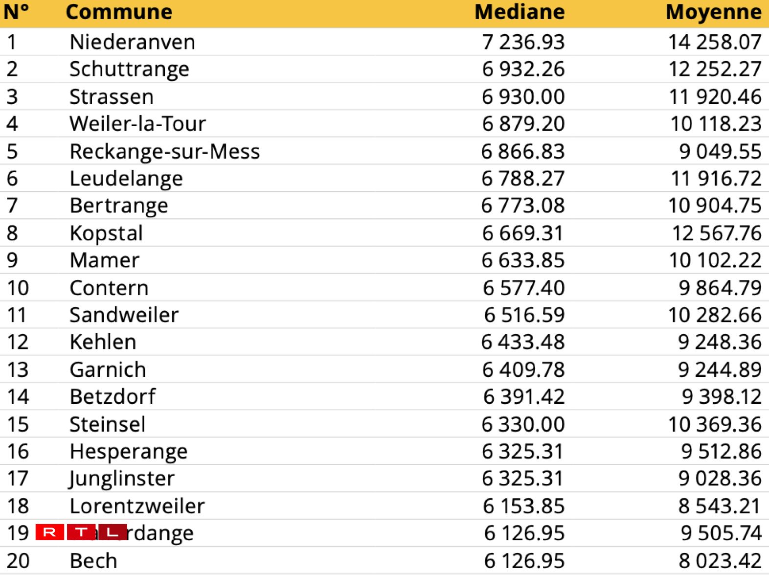 Niederanven also leads in median salary at €7,236. In this ranking, the municipality of Weiler-la-Tour (€6,879) takes fourth place from Leudelange, demonstrating how the median can change the hierarchy compared to average salary figures.