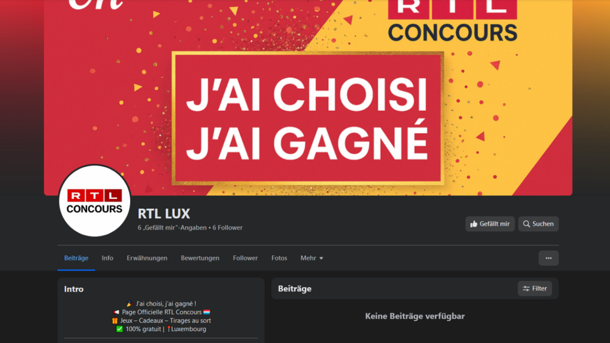 This page is trying to attract people by using the RTL logo and adding the word “Concours” (competition). The page poses as a radio station and even uses RTL’s Kirchberg address as its headquarters. However, this page was not created by RTL’s social media team or any other RTL team, and has no connection whatsoever to RTL.