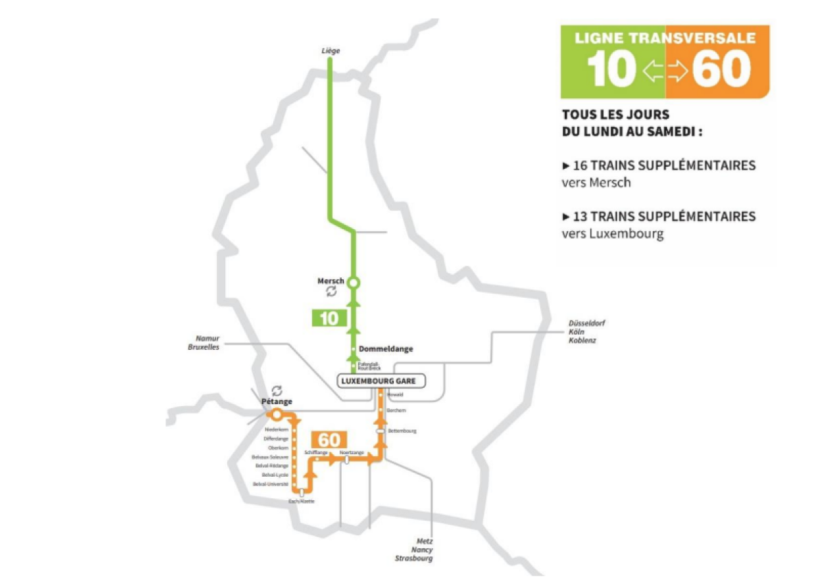 From Monday to Saturday on the Pétange to Mersch line via Luxembourg City, 16 more trains will run throughout the day. The first train will depart at 5.08 am in Pétange.