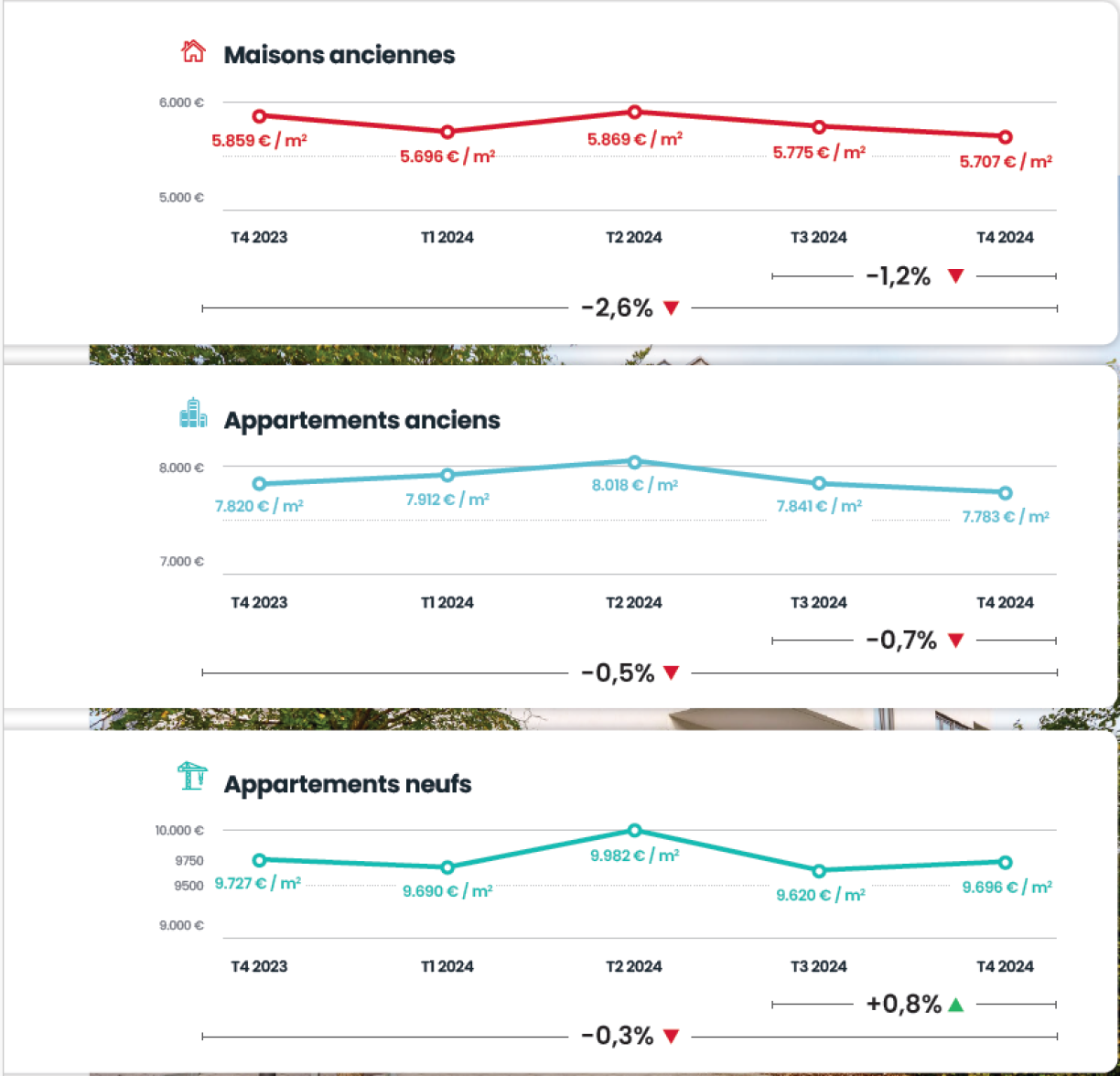 In the last three months of 2024, the national average saw a decline in the prices of older houses, with a drop of 2.6% over the year. Existing apartments saw a smaller decrease of 0.5%, while new apartments experienced a modest fall of 0.3%.