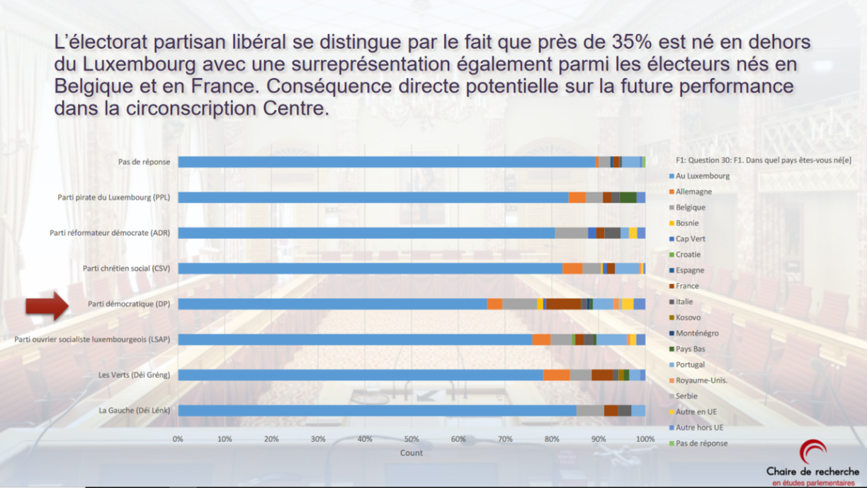 The Democratic Party (DP) stands out as the most internationally oriented, with nearly 35% of its supporters originating outside the Grand Duchy, and approximately 30% possessing dual nationality. A closer look reveals that individuals hailing from Belgium and France are notably overrepresented among those born abroad. Analysts speculate that this phenomenon might directly influence the DP’s performance in the Centre constituency. Conversely, the Pirate Party, the Left Party (déi Lénk), and the Christian Social People’s Party (CSV) have the highest percentage of voters born within Luxembourg’s borders.
