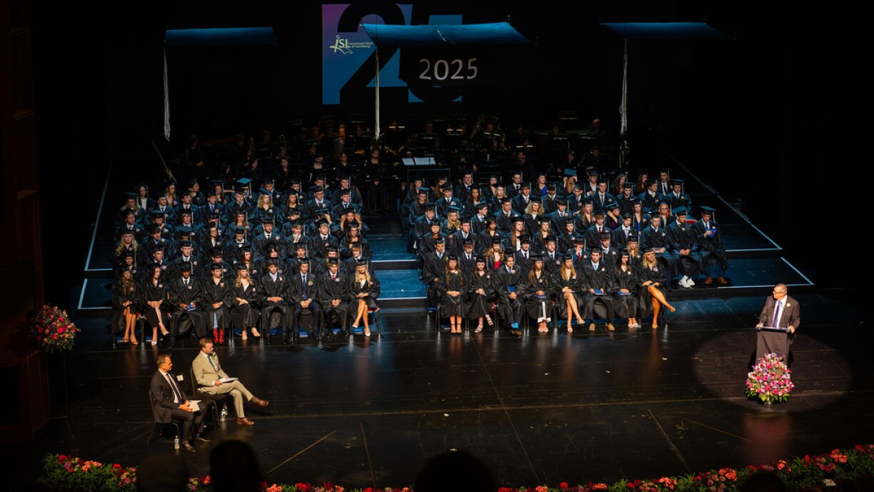 Student speakers Raphaëla Delattre and Jaron Shepro, both long-time ISL students, offered humorous and heartfelt reflections on their school experiences. Delattre, who received the ECIS Award for leadership and international understanding, urged classmates to stand up for what is right and promote inclusivity. Shepro encouraged peers to embrace reinvention and community as they begin new chapters in their lives.