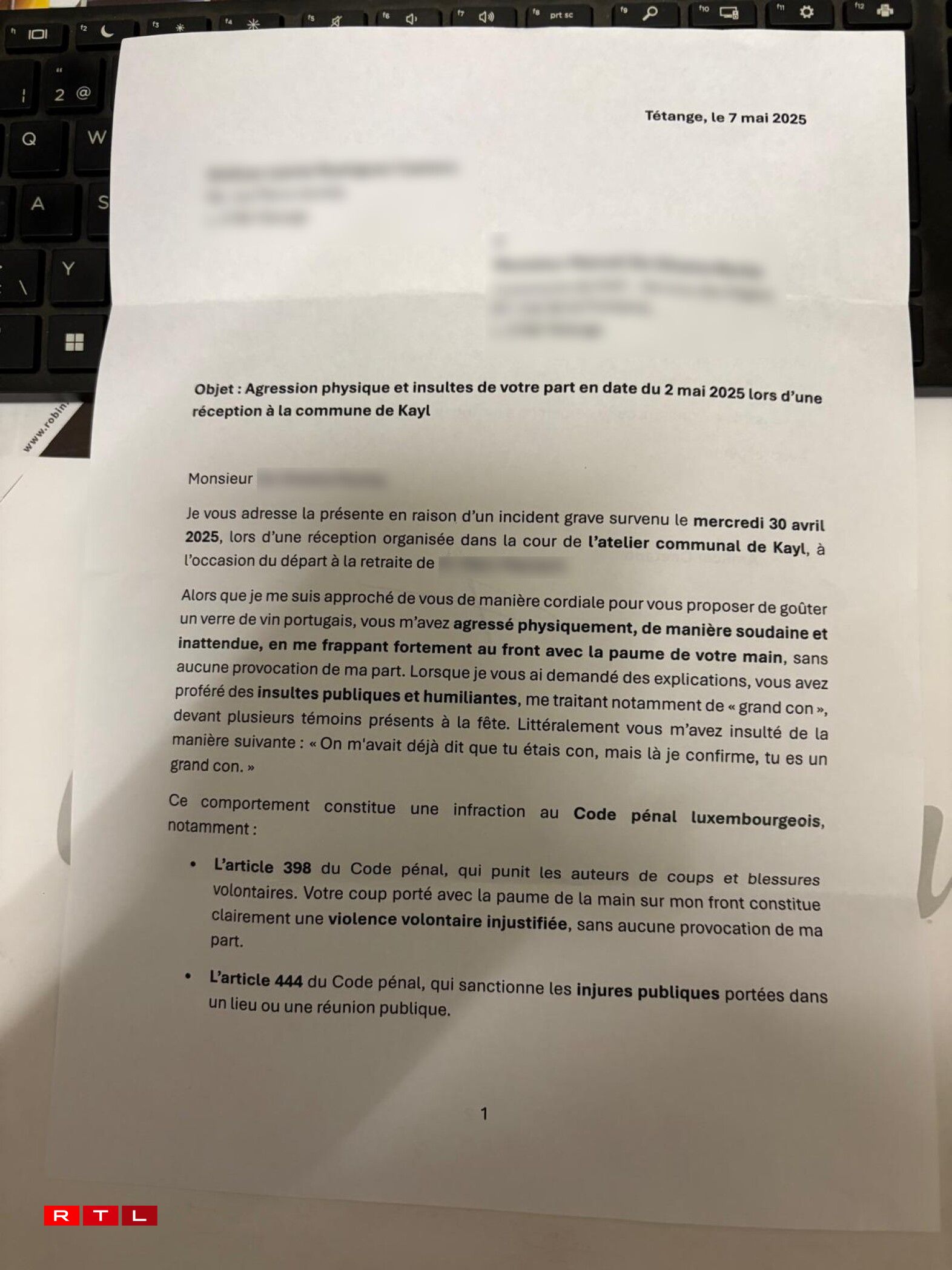 A retirement party at a Kayl municipal building on 30 April turned contentious when Councillor Amilcar Caetano of the Alternative Democratic Reform Party (ADR) reported being verbally and physically assaulted by a municipal worker. The altercation escalated after Caetano sent a letter demanding €2,000 from the municipal worker in exchange for not filing a police complaint – a demand the municipality subsequently forwarded to the Ministry of Home Affairs.