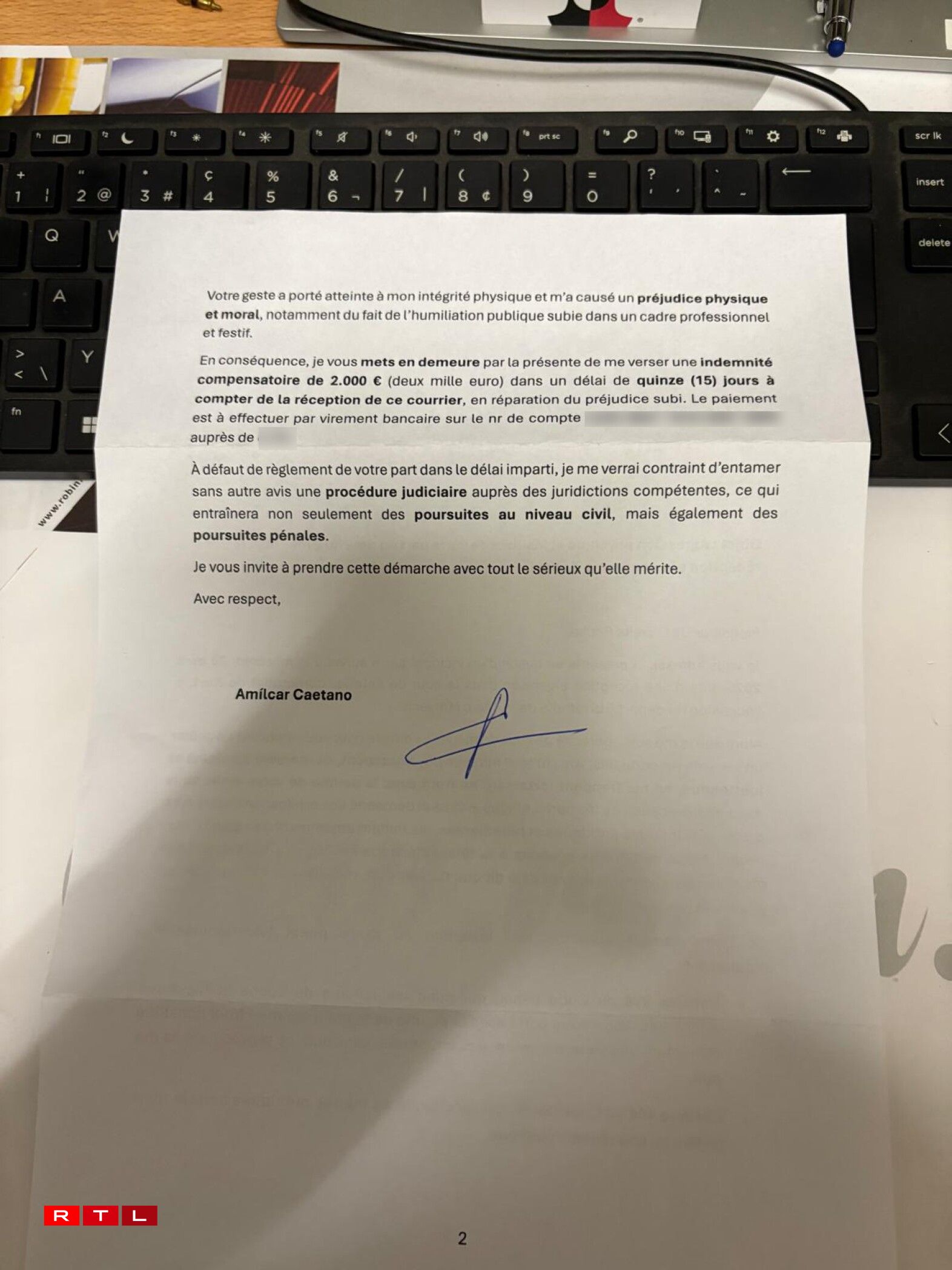 Legal expert Jean-Jacques Schonckert told our colleagues from RTL Radio that Caetano’s financial demand does not constitute blackmail under Luxembourg law, noting out-of-court damage settlements are standard practice.