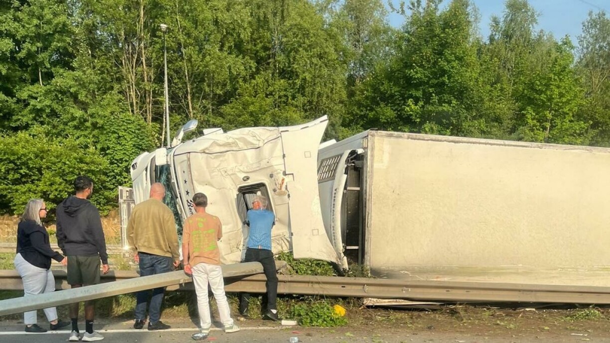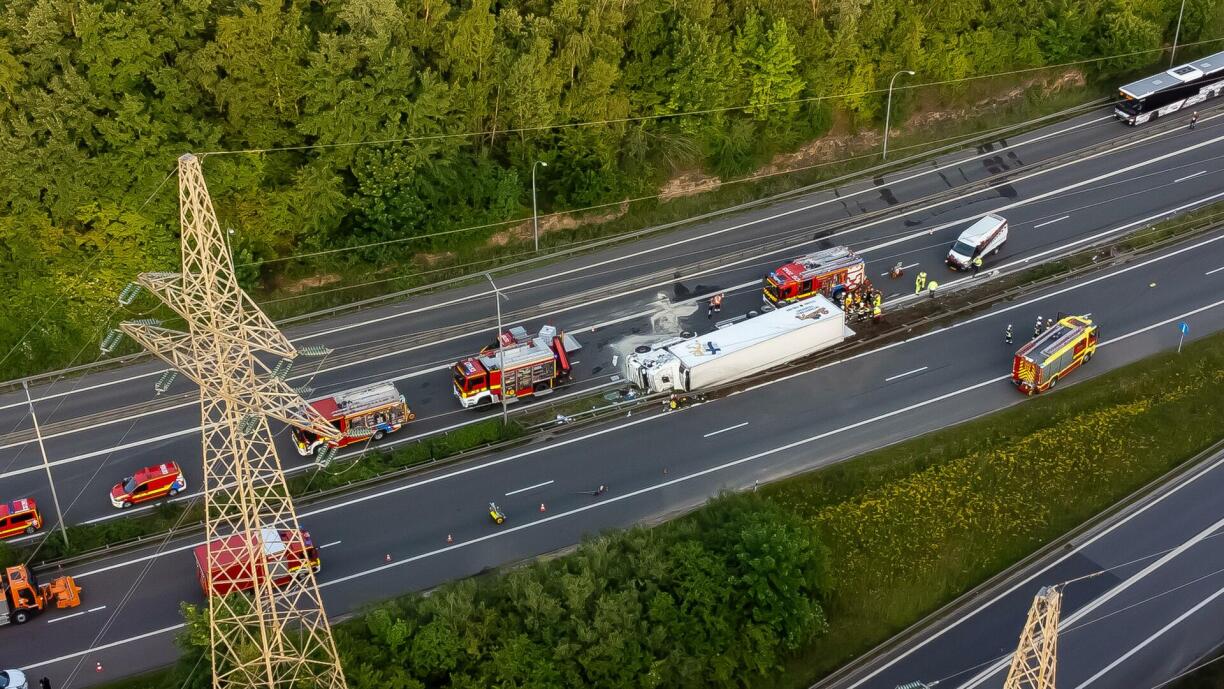 A lorry overturned on the A1 motorway near Kirchberg on Monday evening, leading to a full closure of the highway and significant traffic disruptions. The incident, which left one person injured, occurred around 7.25pm on the A1 heading toward Trier, near the Kirchberg exit.