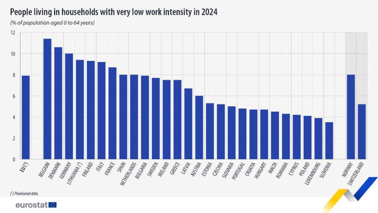 The study published by the European office of statistics (Eurostat) considers a household of ‘very low work intensity’ as individuals under the age of 64 living in a household where working-age cohabitants are engaged in job activity equal to, or less, than 20% of the total potential work hours for a twelve-month period. Retired persons, students, and children are not included in the statistics.