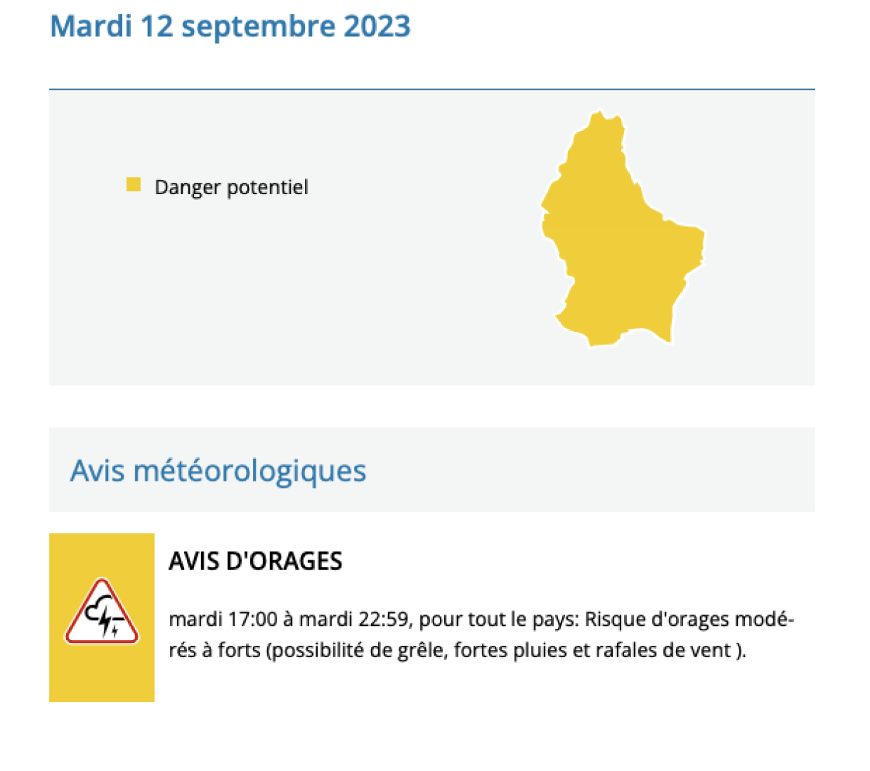 Météolux has raised the alert level to orange, in effect from 5pm to 10pm on Tuesday, signalling the likelihood of “severe” thunderstorms. Luxembourg’s national weather service advises residents to prepare for the possibility of hailstones reaching sizes of up to 1 cm and “heavy rain” that could result in precipitation of up to 35 litres of water per square meter within one hour. In addition, Météolux forecasts “very strong gusts of wind” sweeping across the country, with speeds reaching up to 80 km/h.