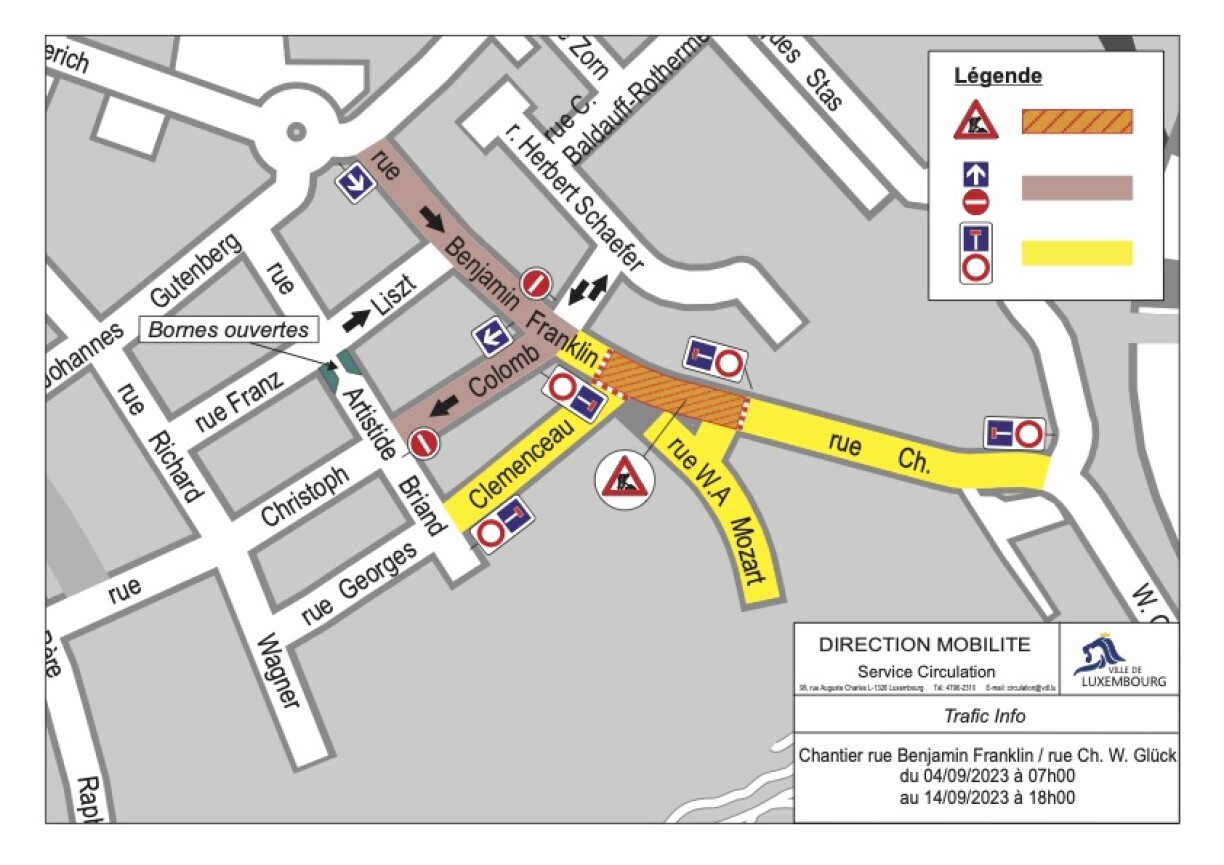 The project involves work on Rue Benjamin Franklin and Rue Christoph Willibald Gluck. These roads will be closed to traffic between Rue Georges Clemenceau (intersection included) and Rue Wolfgang Amadeus Mozart (intersection included).