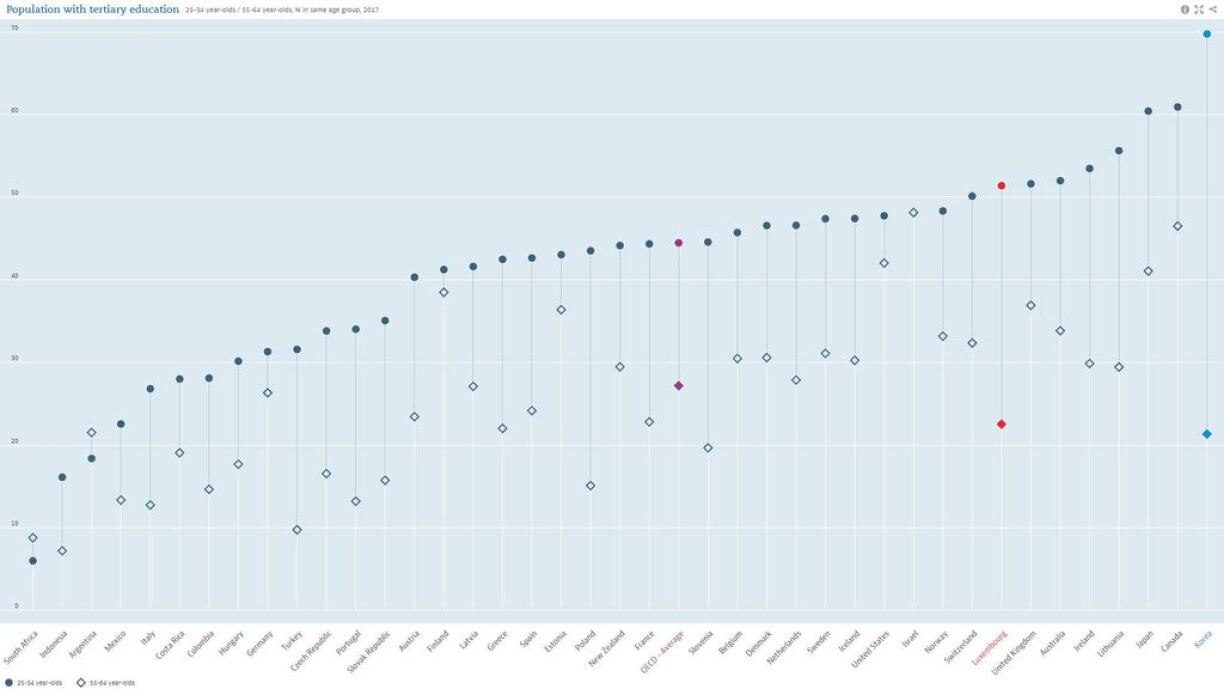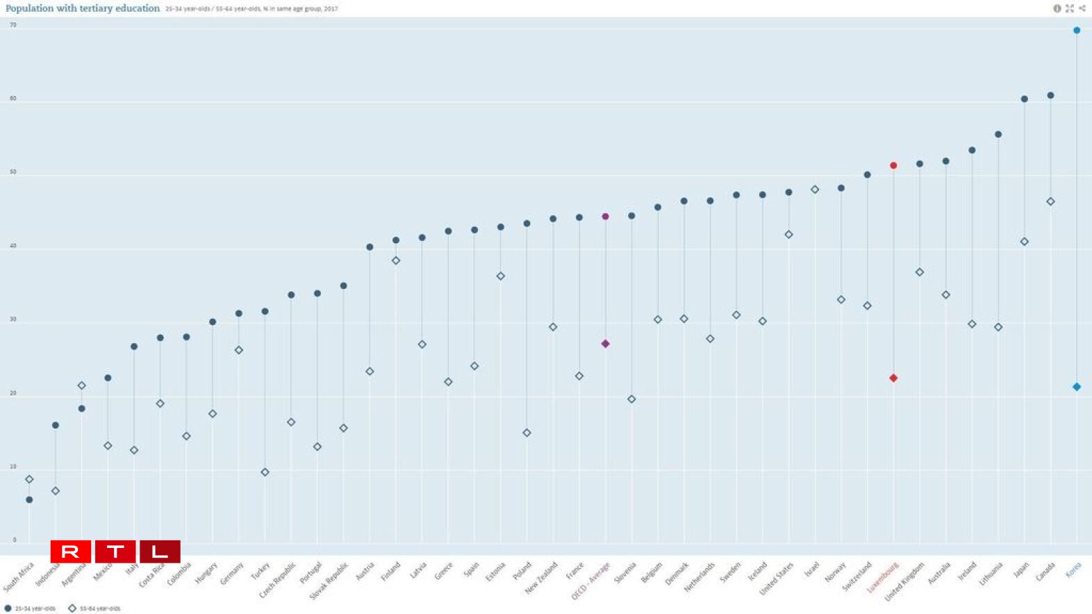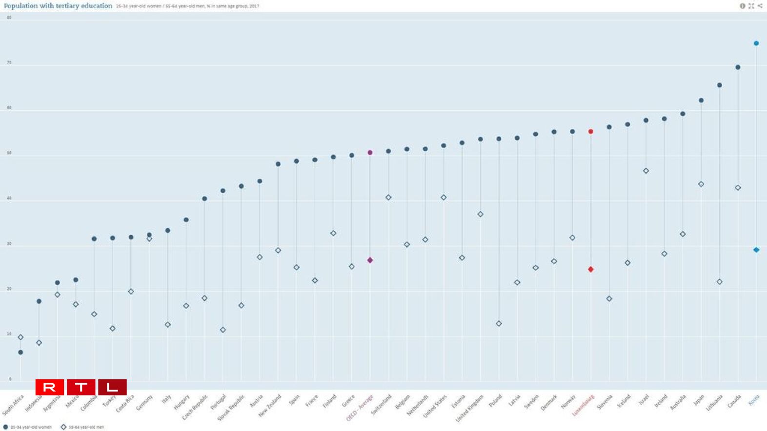 In Luxembourg, 47.4% of the male population and 55.3% of the female population go on to third-stage education, compared to 65.1% of men and 74.9% of women in South Korea.