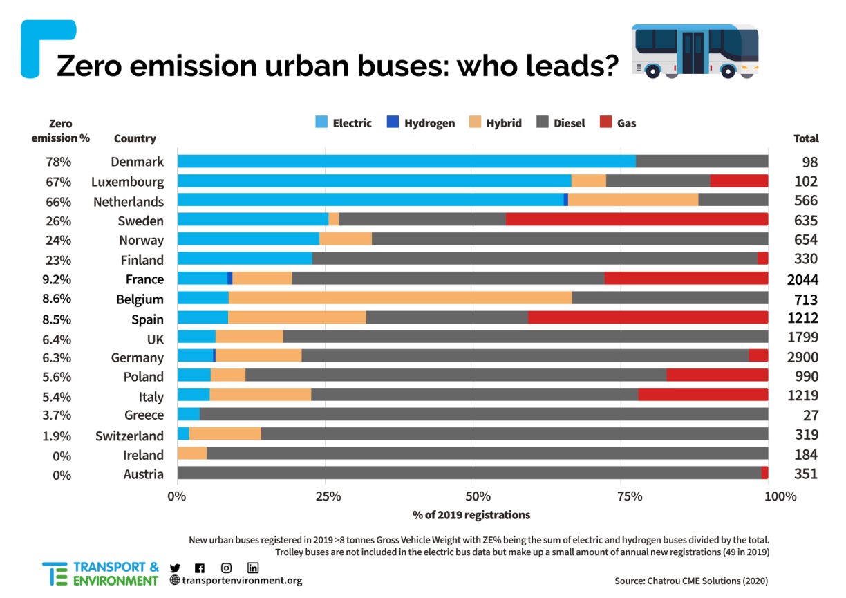 Larger European countries such as Poland, Germany, Spain, France and the UK are lagging behind. In 2019, less than 10% of their newly-registered buses were electric or hydrogen powered.