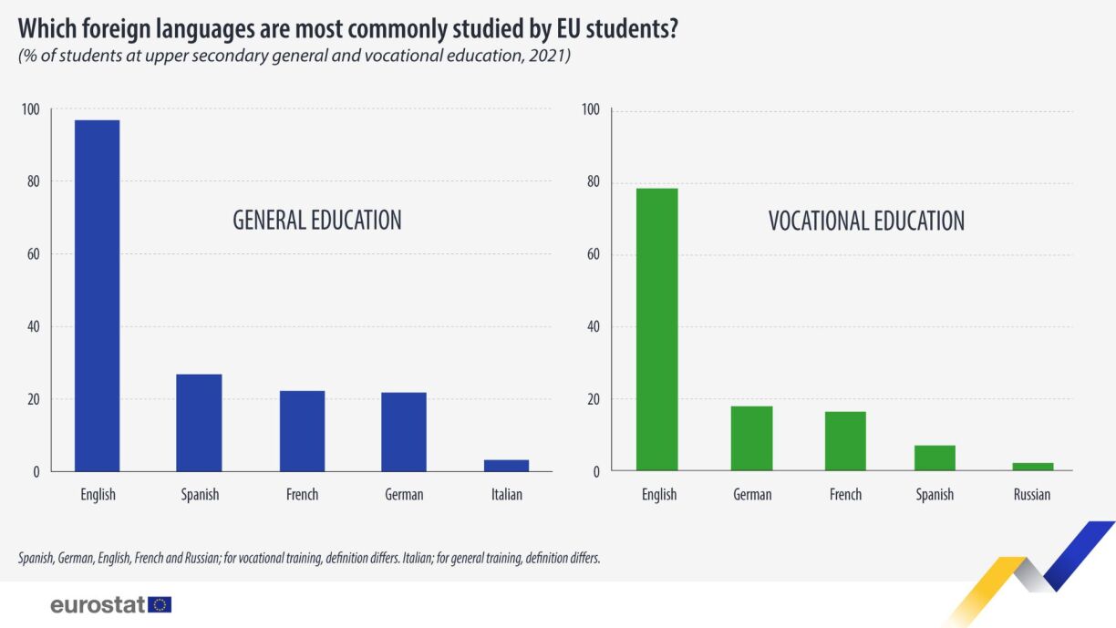 In the broader EU context, English remains the predominant choice, with 96.8% of students in general upper secondary education and 78.6% in vocational education opting for the global lingua franca. Spanish, French, German, and Italian also have significant followings, showcasing the EU’s rich tapestry of linguistic diversity.