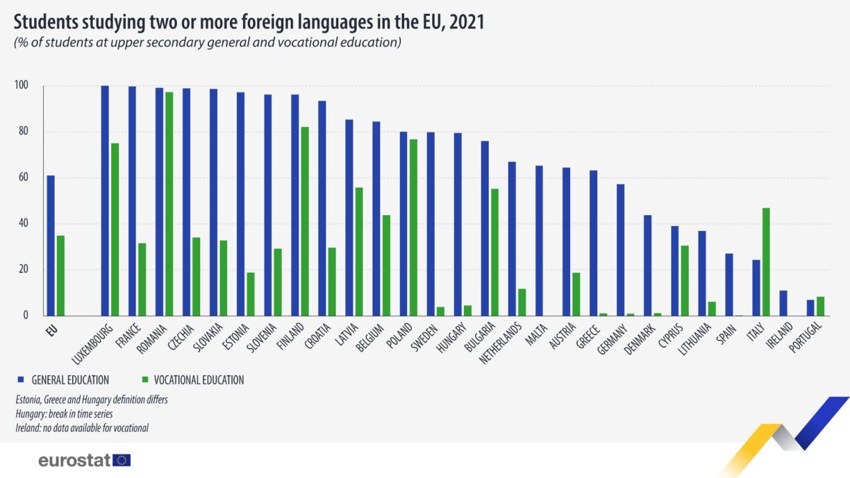 Furthermore, Luxembourg’s achievement is significant in light of the 2021 data that indicated only 61.0% of students in upper secondary general education (ISCED level 34) across the EU studied two or more foreign languages. In vocational education (ISCED level 35), this figure dropped to 34.9%.