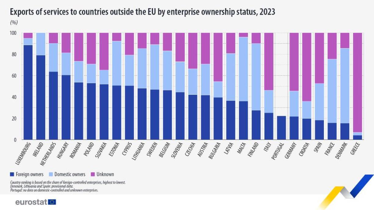 According to new Eurostat data, Luxembourg was followed by Ireland (79.1%) and the Netherlands (63.7%) in the share of foreign-controlled service exports.