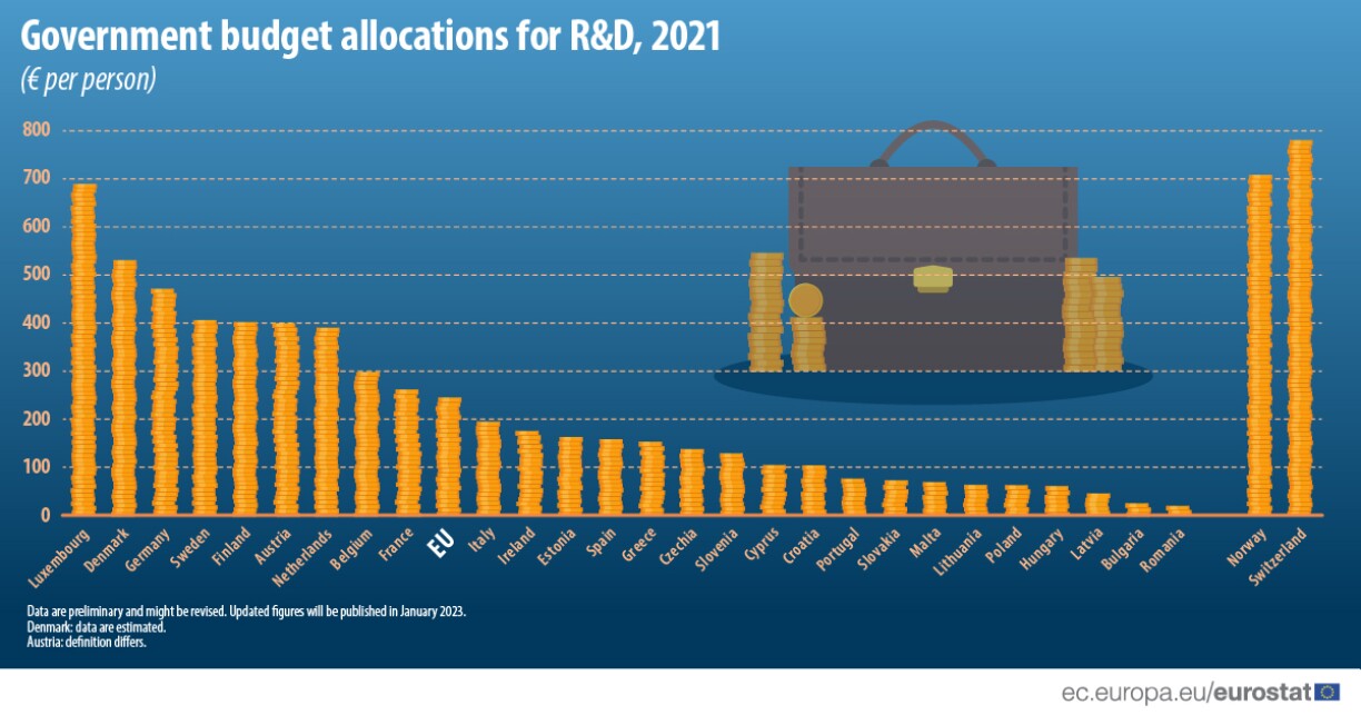 The latest figures show that the government allocated €689 per person on R&D activities in 2021. This is far above the EU average of €244 per person.