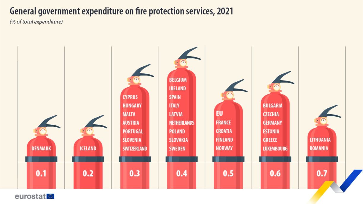 Among the EU nations, Lithuania and Romania took the lead in 2021, dedicating 0.7% of their total expenditure to fire protection services. They were closely trailed by Bulgaria, Czechia, Germany, Estonia, Greece, and notably, Luxembourg, each channeling 0.6% of their total spending towards this cause.