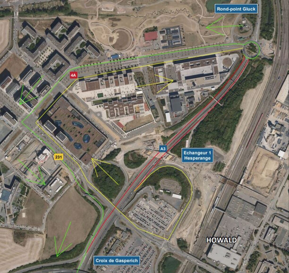 Traffic from the Gluck roundabout heading towards the Gasperich crossroad will be diverted via the N4A (Kockelscheuer Boulevard), the CR231 (F.W. Raiffeisen Boulevard), and the Hesperange interchange.