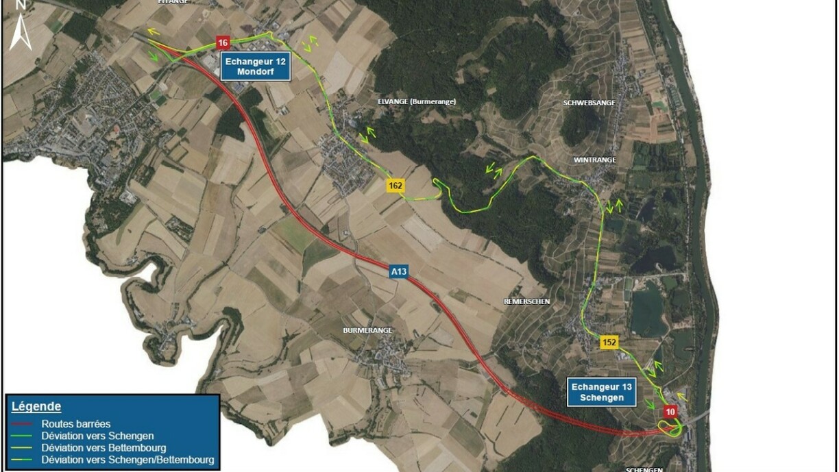 Traffic coming from the A13 motorway and heading towards Pétange will be diverted via the Schengen interchange, the N10, the CR162, the CR152, the N16 and the Mondorf interchange.