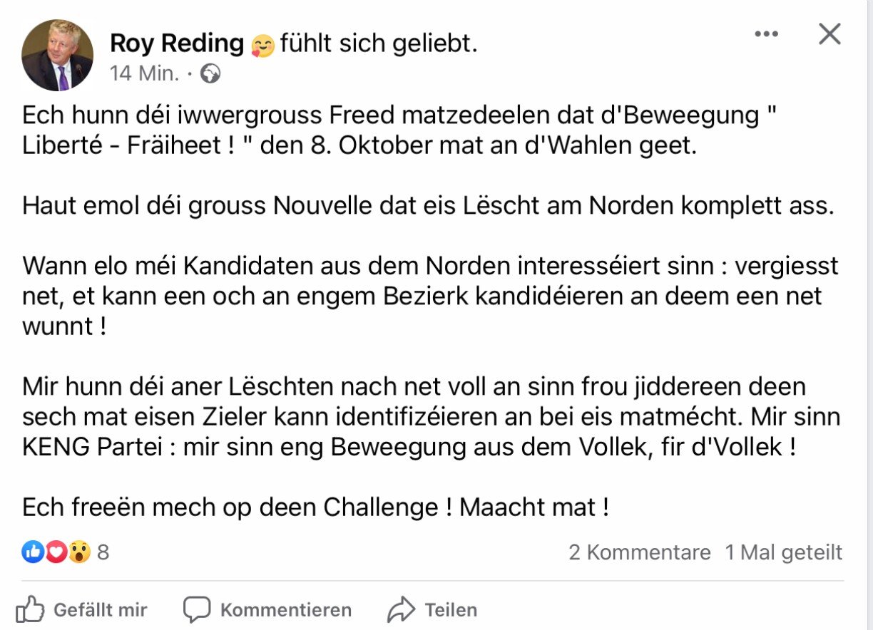 Reding clarified that his movement should not be perceived as a citizens’ list, emphasising that potential candidates must align with and endorse the Liberté manifesto.