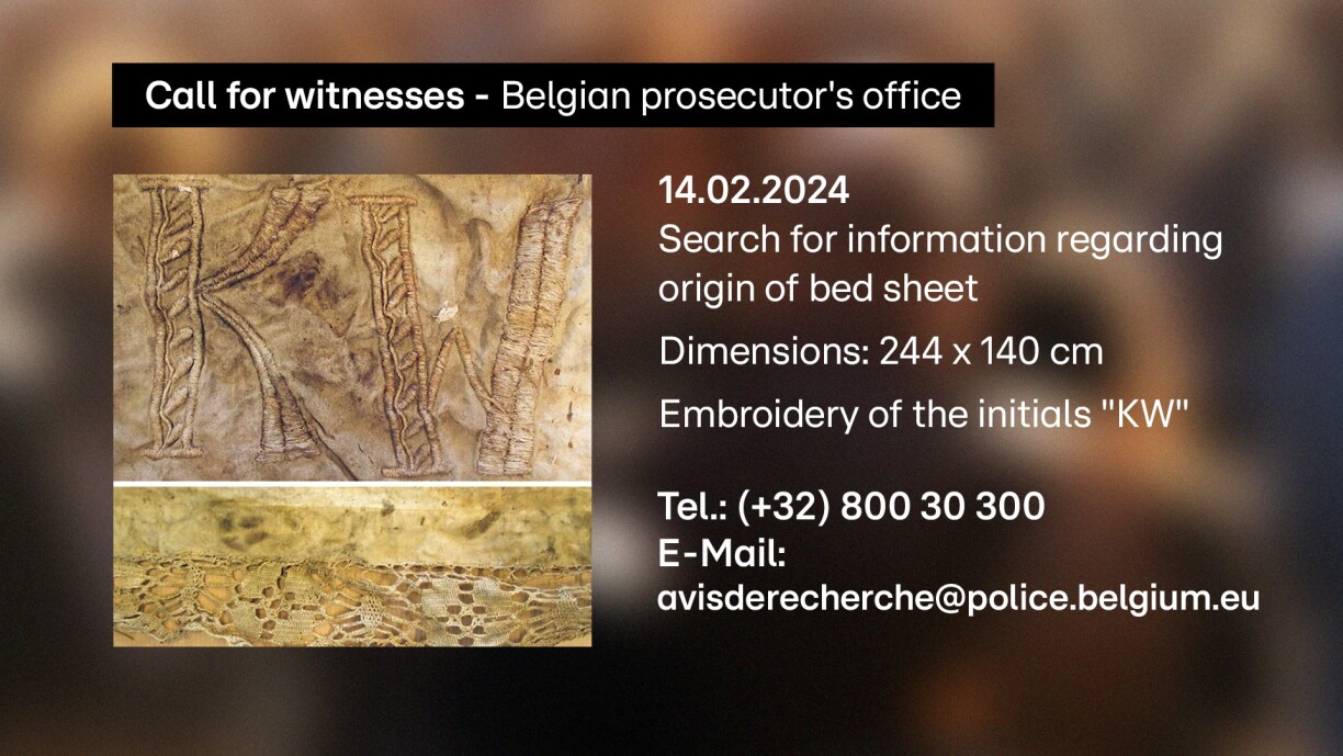 Belgian investigators are seeking information regarding the origin of a bed sheet, which is said to be aged and has undergone alterations. The sheet measures 244 cm in length and 140 cm in width, crafted from light-coloured cotton. Notably, it features an embroidery of the initials “KW” near the hem.