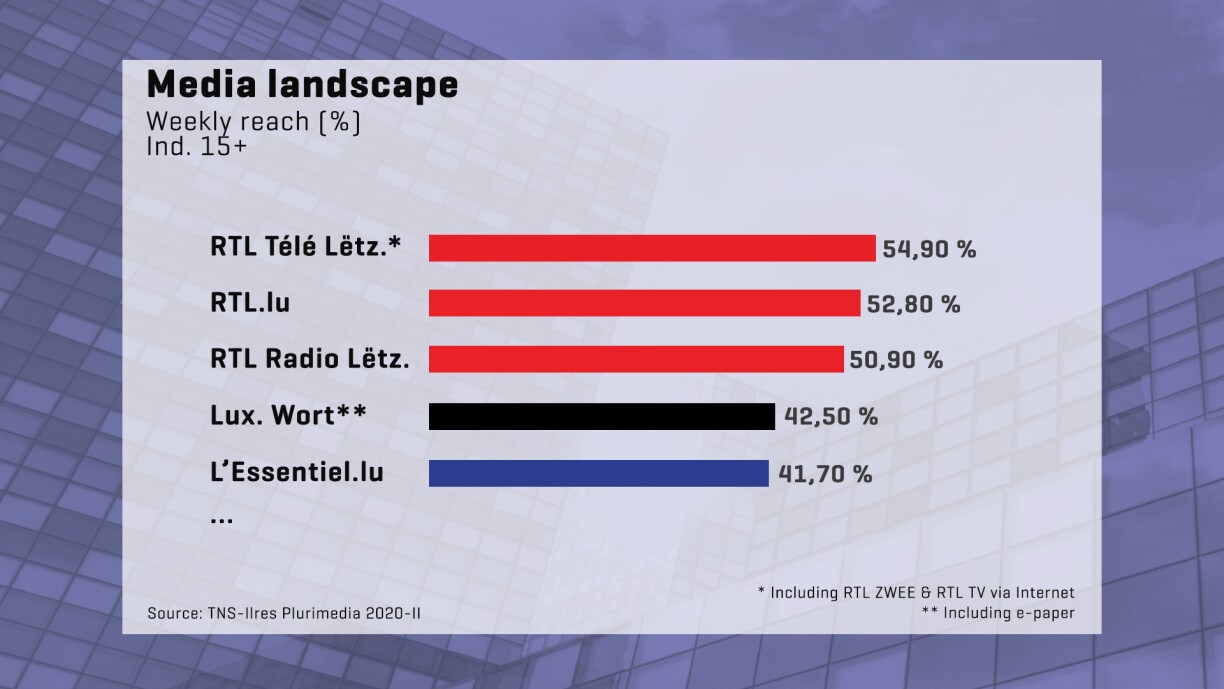 RTL.lu (including RTL Today & RTL 5minutes.lu) attracts 187,900 users per day (35.7% of the pop. 15+). This score makes it the most popular media in Luxembourg (based on daily coverage).