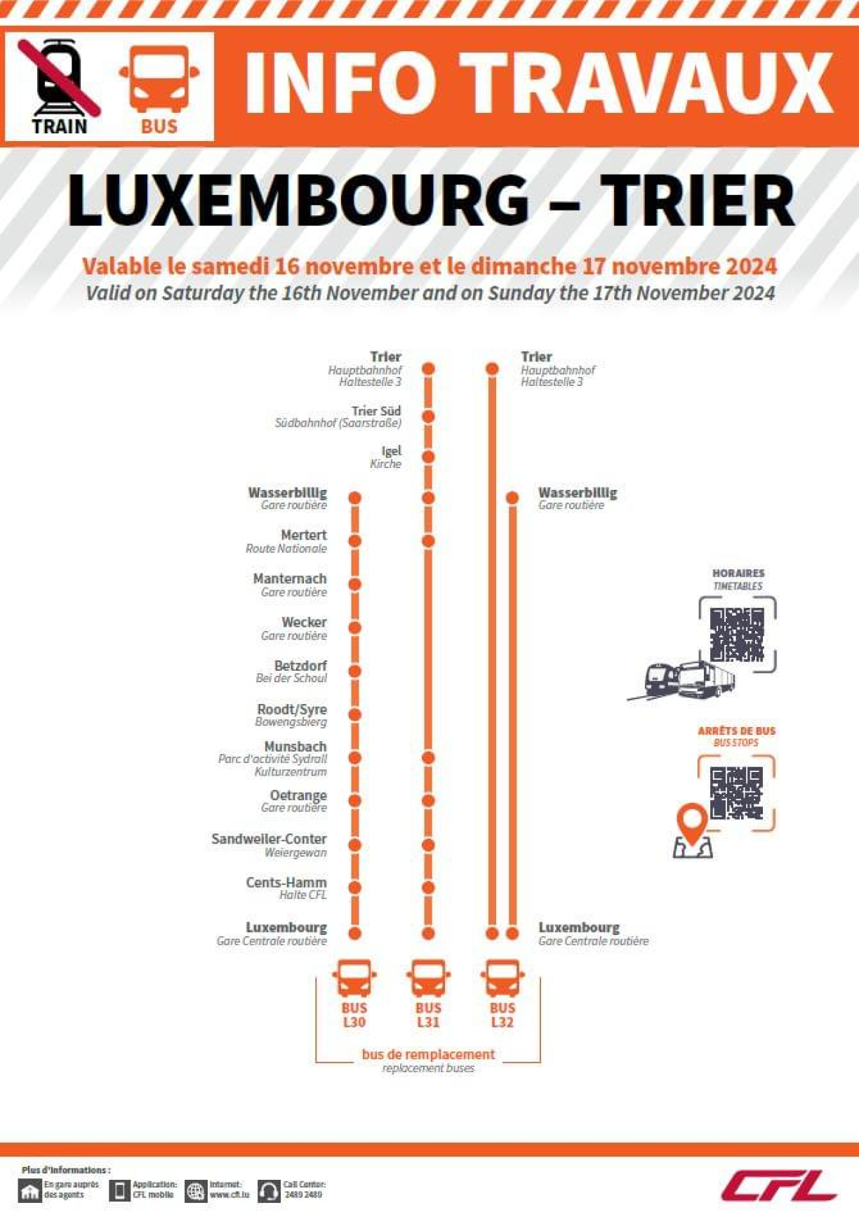 Bus L30 will stop at all stations between Wasserbillig and Luxembourg City, L31 will stop at the German stations along the line as well as Wasserbillig, Mertert and Luxembourg City, and L32 will act as a fast bus between Trier, Wasserbillig and Luxembourg City.
