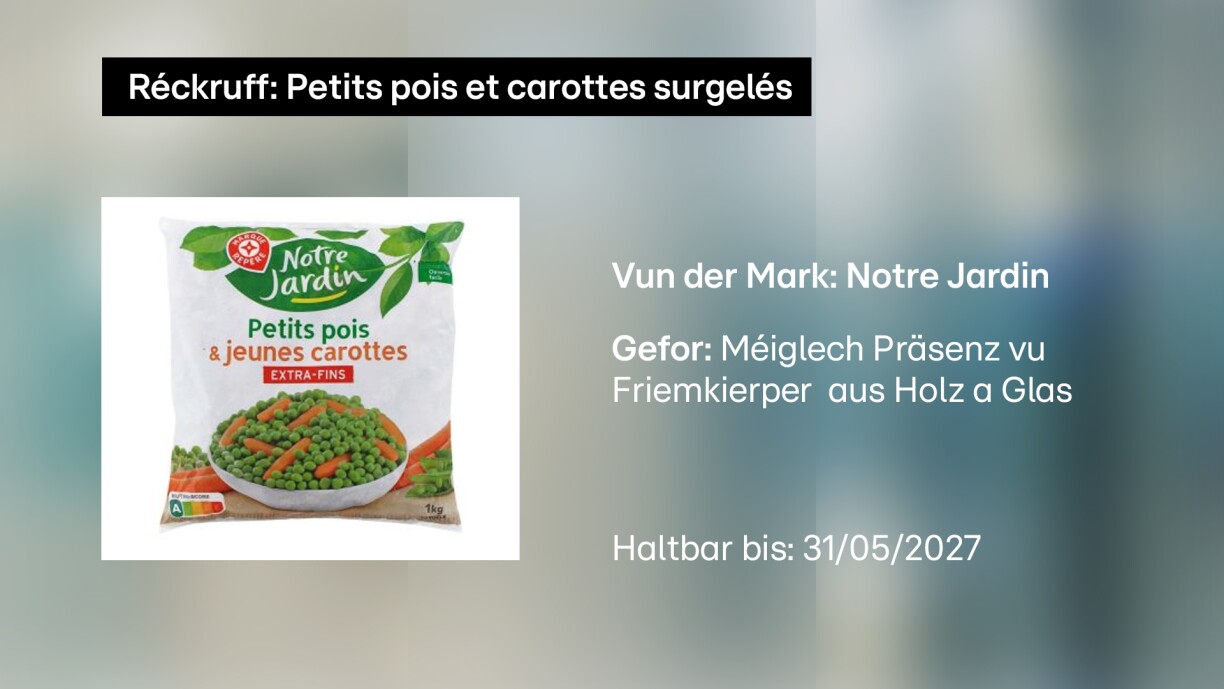 Frozen peas and baby carrots sold under the brand name ‘Notre Jardin’ are being recalled due to the ‘possible presence of foreign bodies such as wood and glass’.