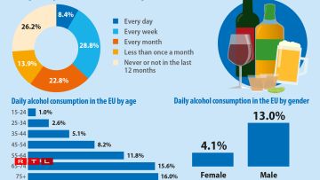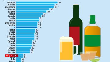 Eurostat explains that a “heavy episodic drinking” episode is when a person ingests the equivalent of 60 g of ethanol or more in one sitting. The countries with the lowest numbers are Cyprus (4%), Italy (4%) and Spain (6%).
